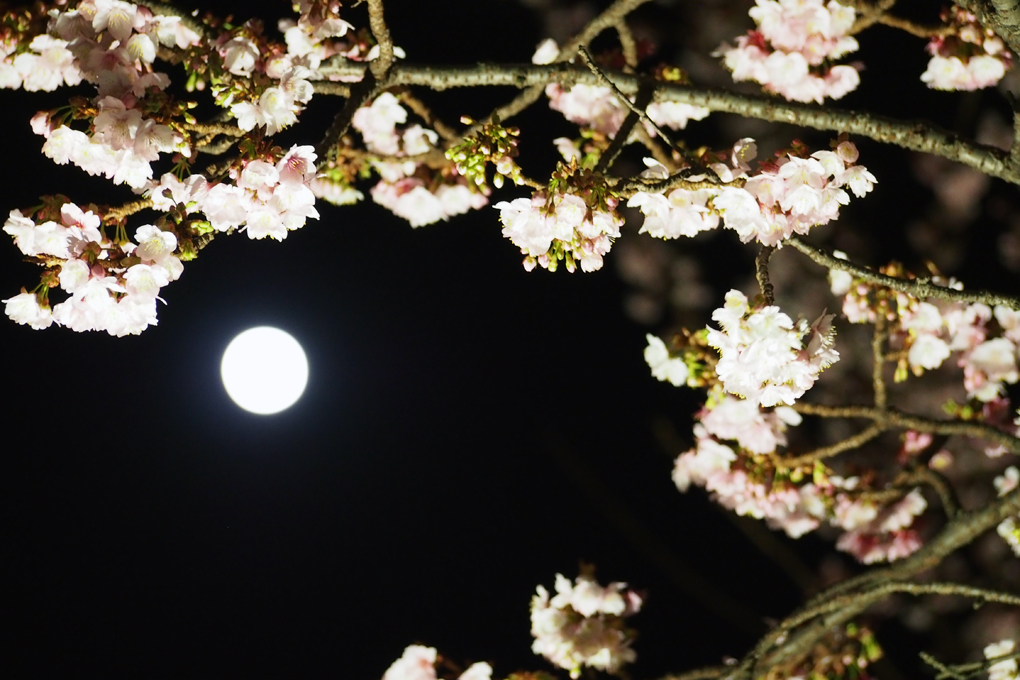 今、熱海市内中心部を流れる糸川沿いにてあたみ桜が見頃を迎えようとしています。「あたみ桜糸川桜まつり」は1月21日(土)から2月12日(日)と3週間程行われますが、暖冬で例年より早く開花が進んだため、ライトアップは前倒しとなりました。ちょうど満月と重なりあたみ桜との共演を楽しめました。あたみ桜と月 共演